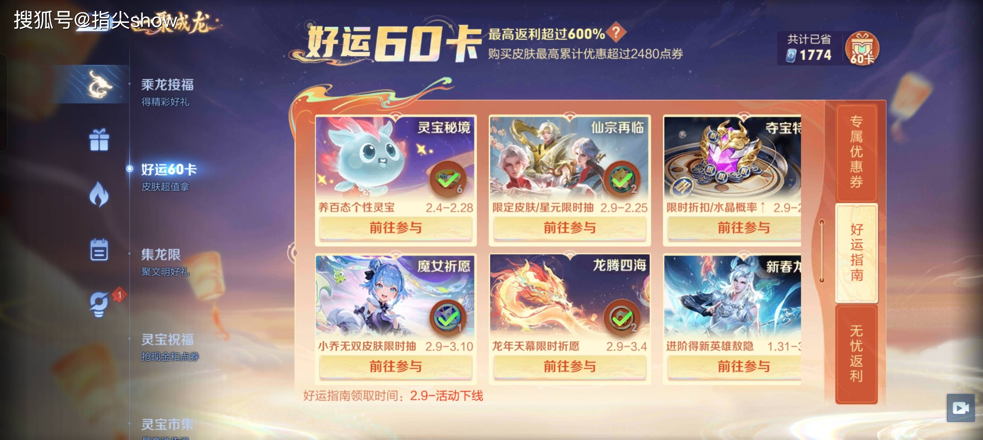 大家好我是指尖,9日王者春节活动正式上线,大家入手了几款皮肤呢?有没有听劝,只要是60卡涵盖的皮肤,哪怕你只买一款,那也是划算的,除了皮肤本身的折扣外,60卡还会赠送其他抽奖的道具,万一欧皇附体,那就赚大了。
