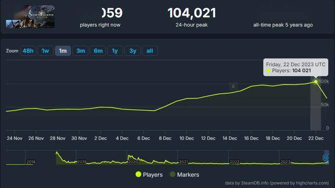 《怪物猎人:世界》于2018年登陆Steam平台,迅速吸引了大量PC平台玩家,当年刚刚发售时同时在线玩家超过了33万,之后的大型资料片冰原发售时也有27万,近日游戏续作《怪物猎人:荒野》的公布让《怪物猎人:世界》再次回归了一波热度,最高在线峰值达到了104021。