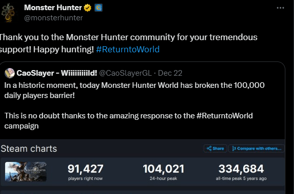 卡普空旗下登陆Steam已经5年的老游戏《怪物猎人:世界》日前Steam同时在线峰值突破10万,官方发推致谢玩家。