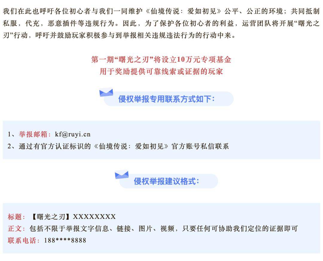 因此在两天前,ROO手游官方宣布将开启“曙光之刃”行动,用10万元向广大玩家悬赏ROO手游外挂和私服的线索,与玩家们一同“抵制私服,支持正版”。