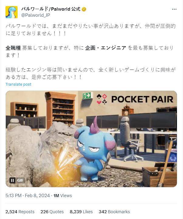 在爆出仅有一名员工在保证服务器的正常运行,并且每个月都将为服务器支出数十万美元的成本后,Pocketpair于近日在推特上发布了紧急招聘启示。