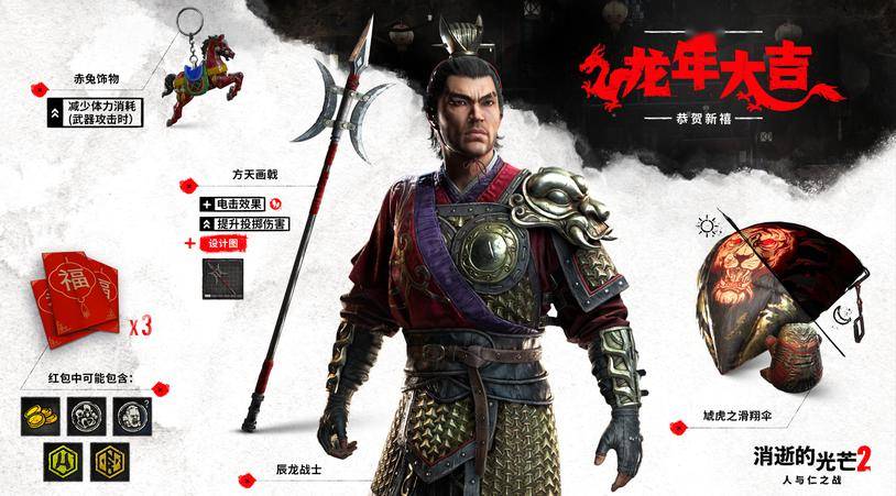 《消逝的光芒2》龙年庆典活动上线,完成目标获取辰龙战士——吕布皮肤和装备。具体内容如下: