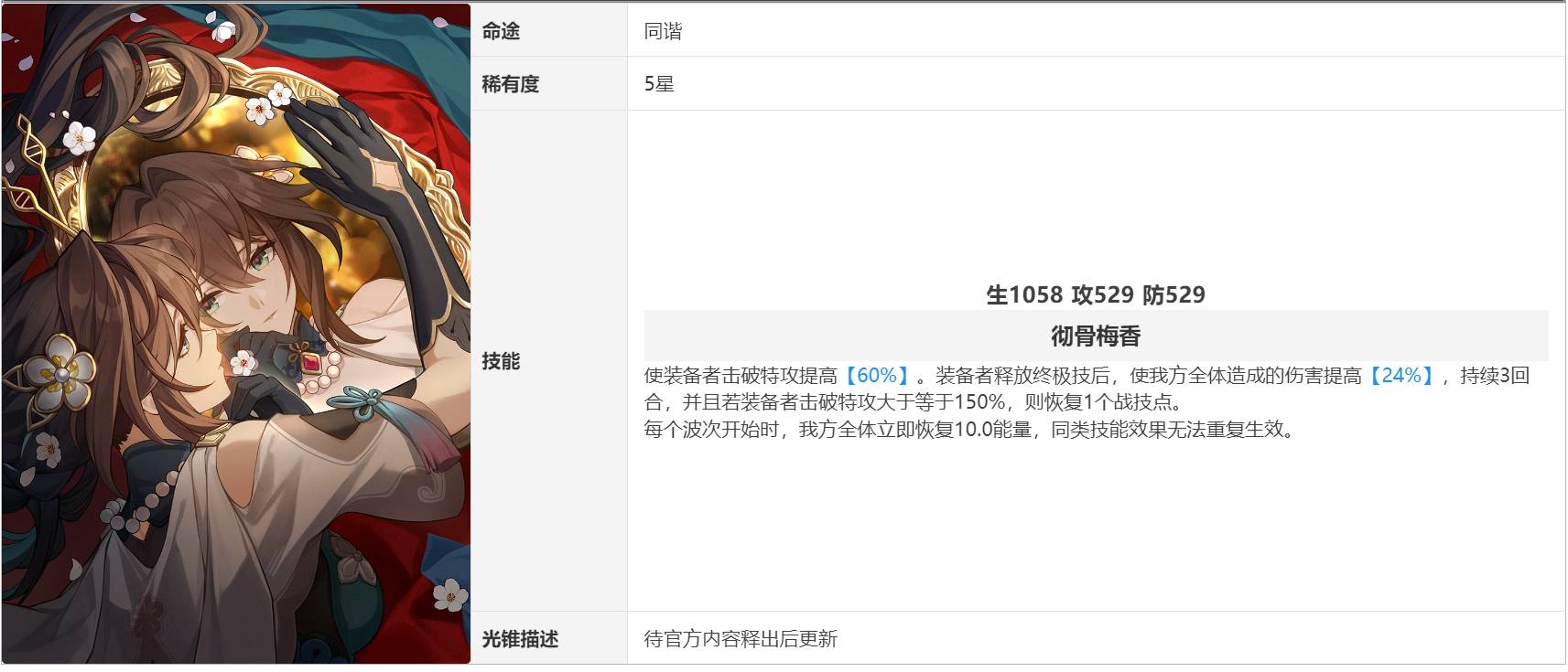 能够提高除了他自身以外其他的我方角色速度,而且不管是我方的哪位角色,只要击破了敌人的弱点阮梅都会对该敌人造成等同于自身冰属性击破伤害的一定比例击破伤害。满级时可达到120%。