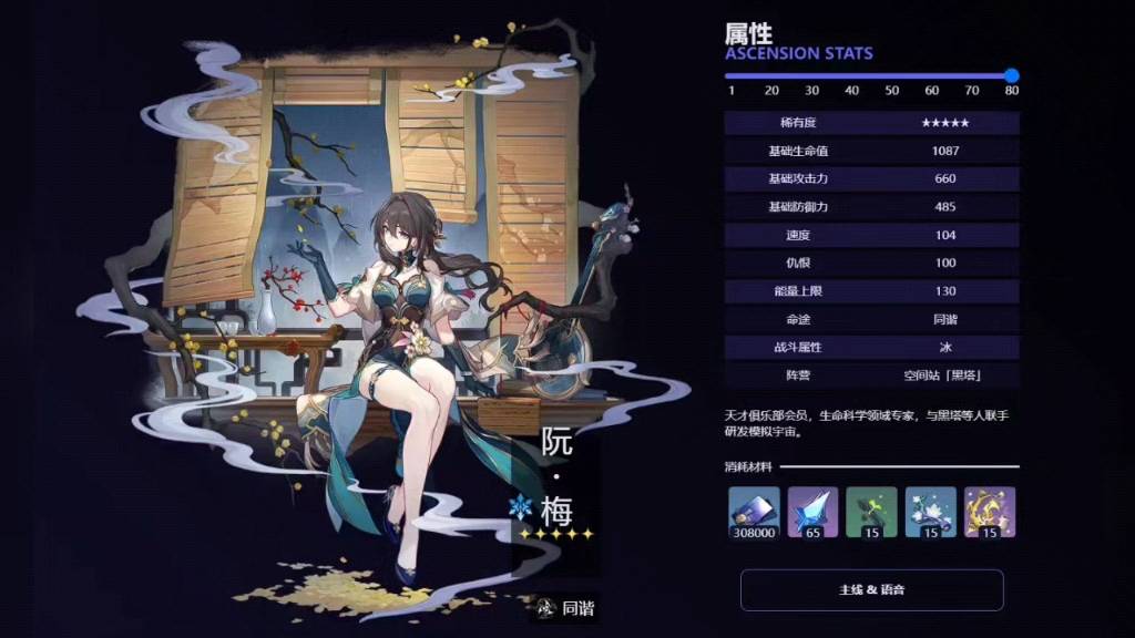 阮梅天才俱乐部的会员以及生命科学领域的专家,也是与黑塔一起创造模拟宇宙的研发者之一。武器是琵琶,冰属性同协命途角色。拥有在击破特攻的各项属性增益BUFF。
