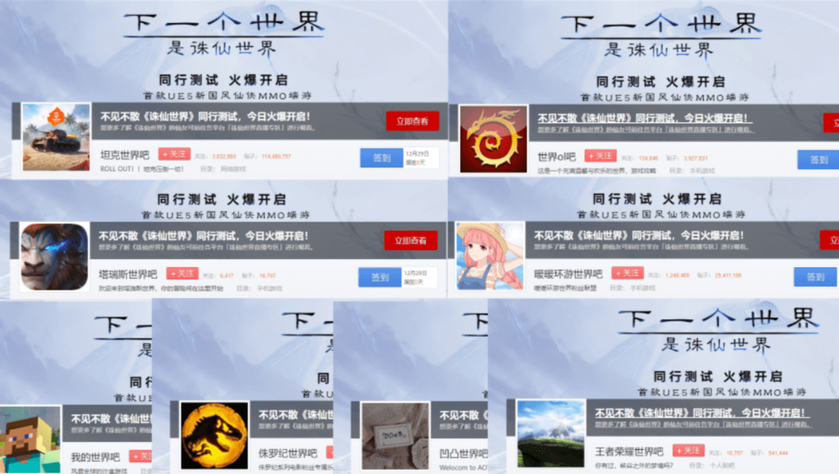 不得不说,做广告还得是你们MMO圈!之前剑网三投放广告,因为误投放了逆水寒,导致半个武侠网游圈都燥起来了;而这次诛仙世界二测开启时,又来了一波大动作,不仅放出豪言“下一个世界,是诛仙世界”,还在所有带名世界的贴吧:魔兽世界、坦克世界、暖暖环游世界等、侏罗纪世界、我的世界、王者荣耀世界等贴吧等都没放过。看到这,我只想问问,这波操作真的6!直接到别人的底盘上去抢人!