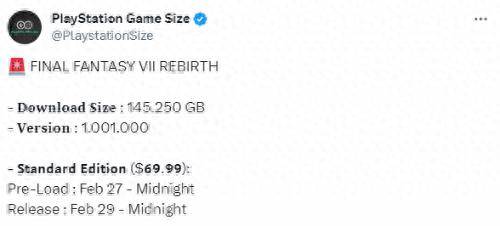 PS数据博主PlaystationSize分享了《最终幻想7:重生》的预载日期以及容量大小: