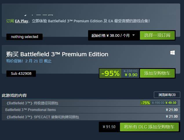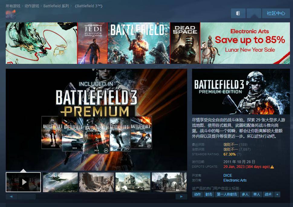 IT之家 2 月 8 日消息,Steam 冬促开始,EA 多款游戏迎来降价,其中《战地 3》高级版更是直接立减 95%,国区仅售 9.9 元创下新的史低,但目前好评率仅有 67%,而且不支持简体中文(支持繁体中文)。