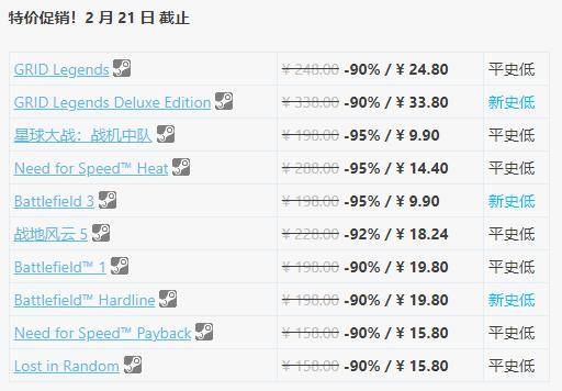 IT之家注意到,除《战地 3》外,《战地 5》也立减 92% 至 18.24 元持平史低,《战地》立减 90% 至 19.80 元持平史低,所以目前看来 EA 底线就是 0.5 折。