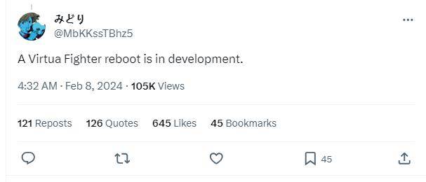 近日推特用户“MbKKssTBhz5”爆料,一款《VR战士》的重启作品正在开发中。
