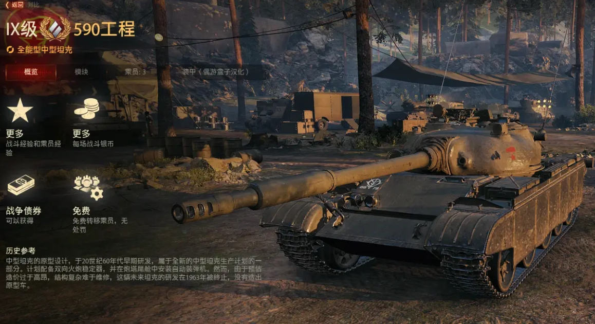 相对反向弹鼓机制,590工程的其他参数就比较平平无奇了。火力方面,它的银币弹和金币弹穿深都不算高(238和268)。生存和机动倒是在9级中坦的及格线之上,240左右的炮塔等效、1800的血量有一定的对线能力;52km/h的前进极速和20km/h的倒车极速,快速抢点、撤离、支援都是没问题的。经过2月7日的紧急加强之后,590工程部分数据有所优化,更值得入手了。