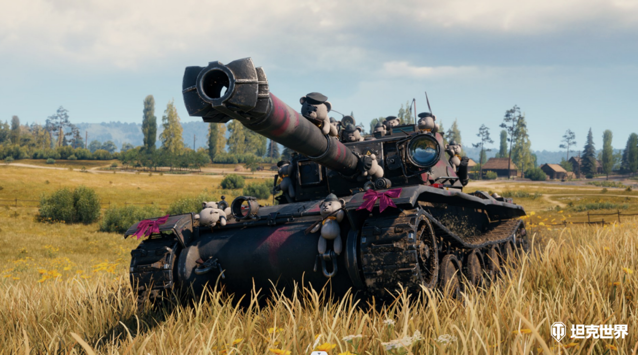 至于另一台金币车“甜蜜派送”,则是一辆充满浪漫气息的坦克。以查狄伦暴风为原型设计的它,融入了小熊玩偶、法式装备、LOVE印字、粉色丝带等个性化元素,显得既优雅又浪漫。有一说一,原生的暴风确实不好看,搭配各种底色、涂装都破破烂烂的。搞一款漂亮的3D风格还是很有必要的,反正我是准备抽一波了。