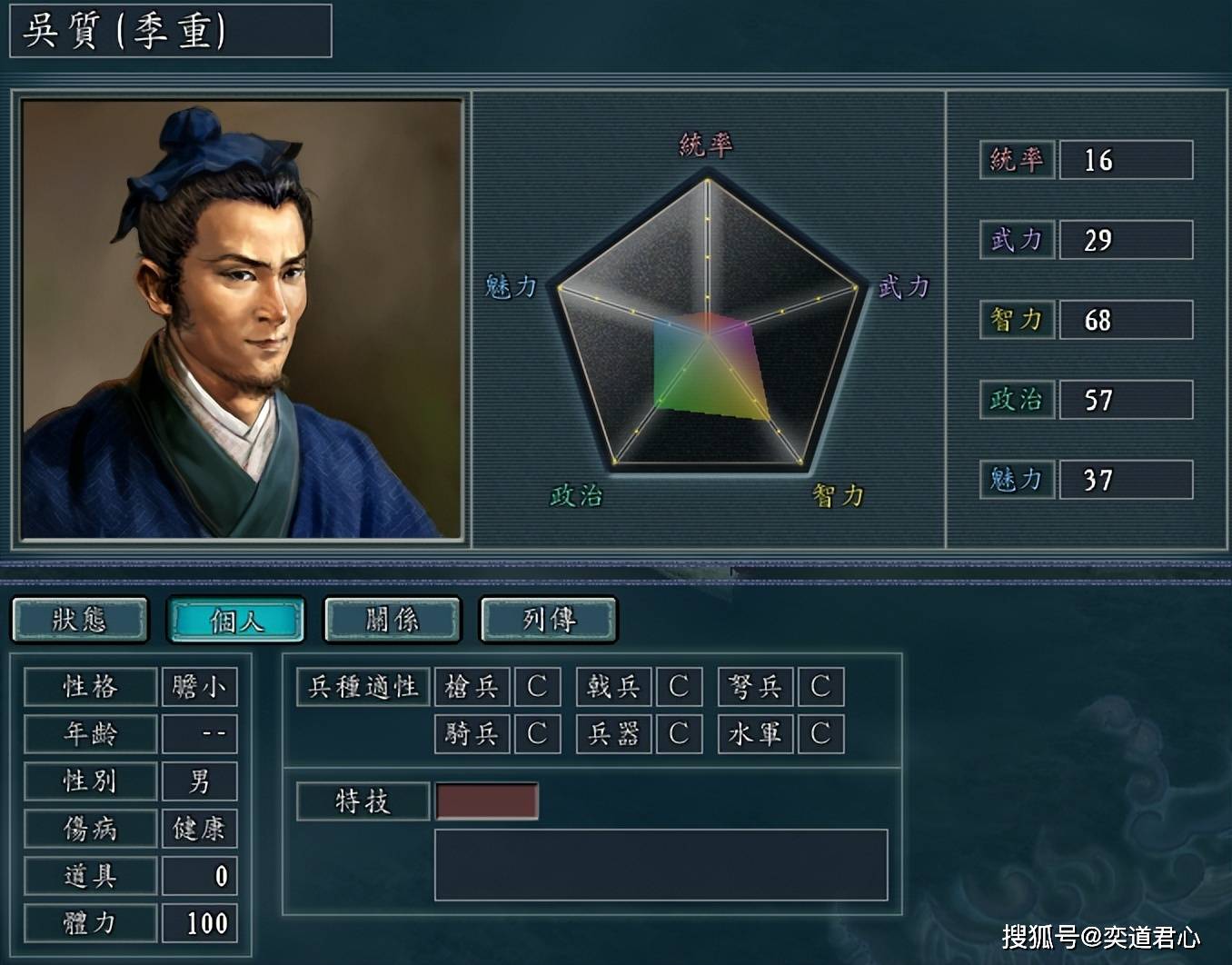 吴质,曹丕四友之一。除了跟主上的私交甚密,他还很会结交其他权贵,比如司马懿。吴质的女儿嫁给了司马师,凭此二人结为姻亲,故而在三国志11游戏里,司马懿亲爱名单的第一个就是吴质。68点的初始智力又是胆小性格,稍微整一下又是个舌战强人。
