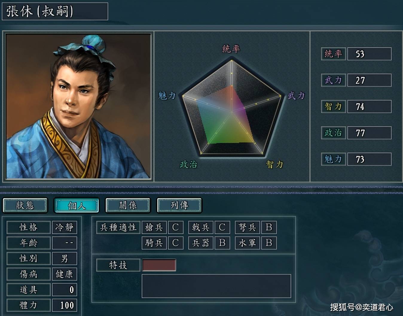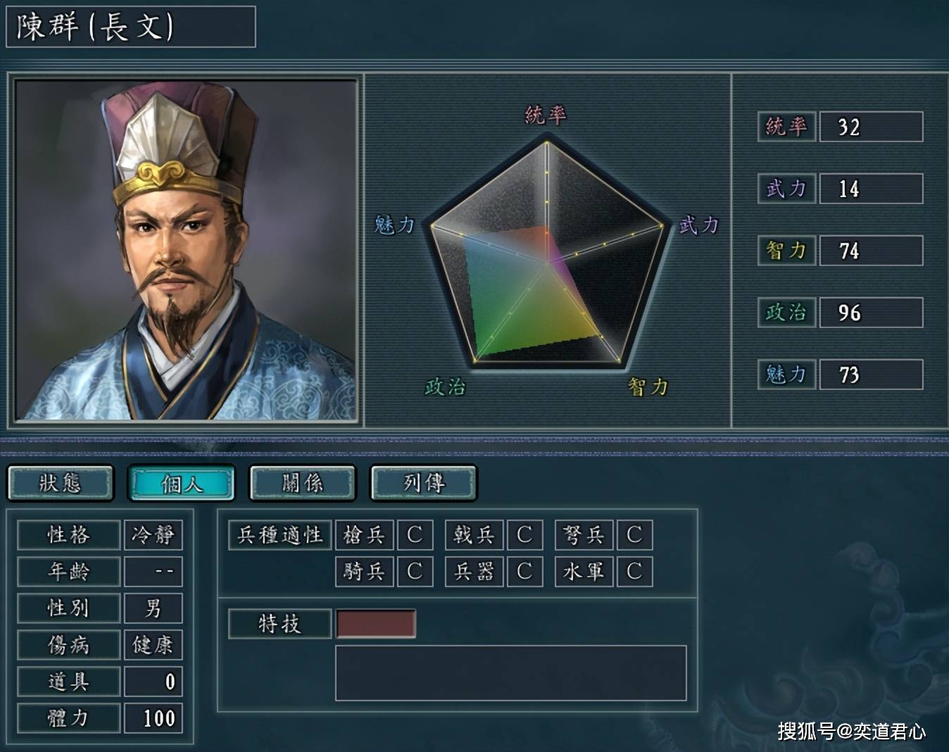陈群,同为曹丕四友,他的实力可比吴质要强大得多,尤其是内政领域,他发明的九品中正制影响深远,连司马懿都自叹不如。在司马懿的亲爱名单里,陈群排名第五,不过他最大的亮点不是人际关系,而是自身的内政水平,三国志11不给技能是真的亏待了他!