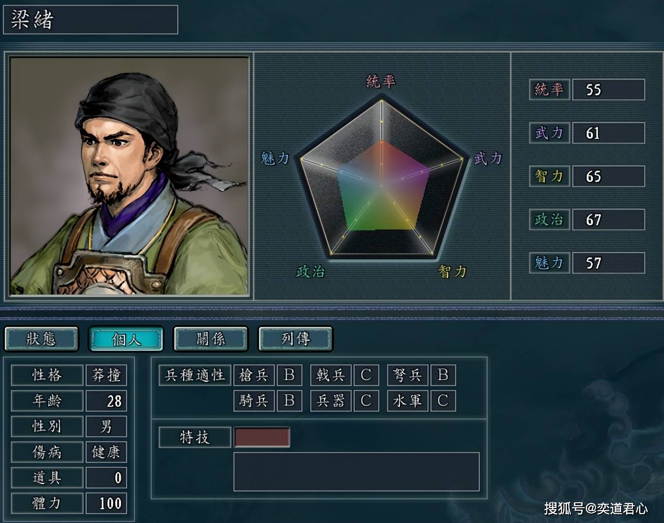 梁绪,本是曹魏的天水郡功曹,与姜维是同事关系。因为太守马遵的出卖,他和姜维、尹赏只能向诸葛亮投降。都说三国志11游戏的五角星战士很吃香,可类似梁绪这样的及格线段位五角星却很鸡肋,看着饱满却没一样能拿出手的。唯一的亮点,就是在姜维的亲爱名单里排名第五。