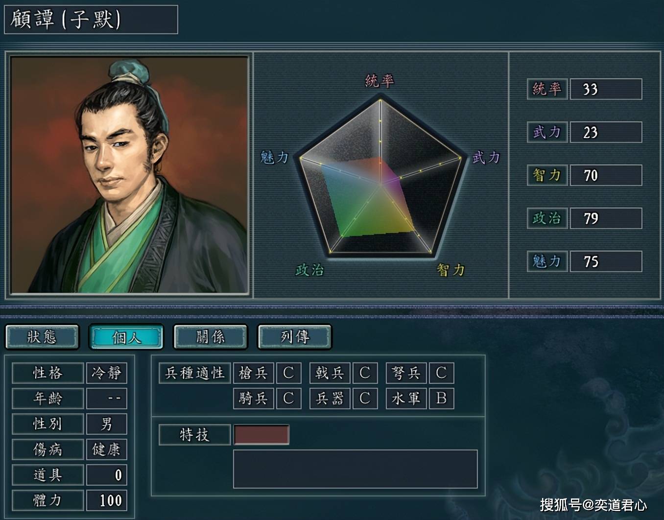顾谭,他是孙吴丞相顾雍的孙子,在诸葛恪的亲爱名单里排名第一,比孙登还要靠前。智力、内政和魅力都还过得去,稍加培养可以跻身到强二线谋士,遗憾顾谭在孙吴内部的斗争中失宠,年仅四旬就去世了。