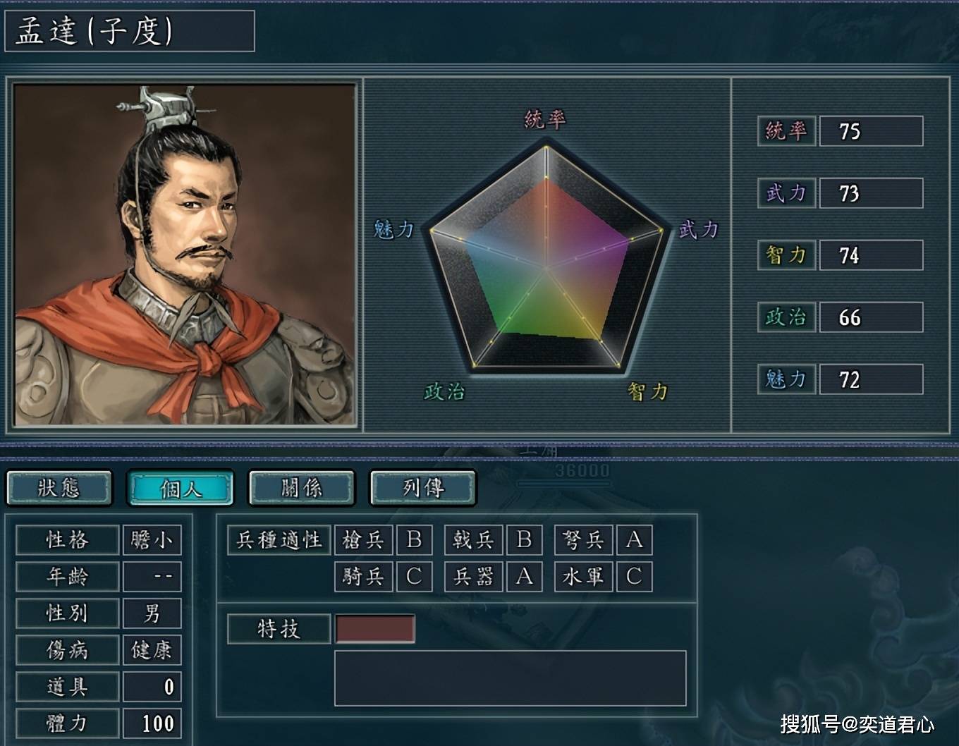 孟达,这个两面三刀的走钢丝人员,虽然历史上的名声不好,却在游戏里是个功能完备的五角星战士。在法正的亲爱名单里,孟达排名第三,比刘备还靠前一位。当然,他自己也是很有实力的,只不过游戏刻意削弱不给他配技能。