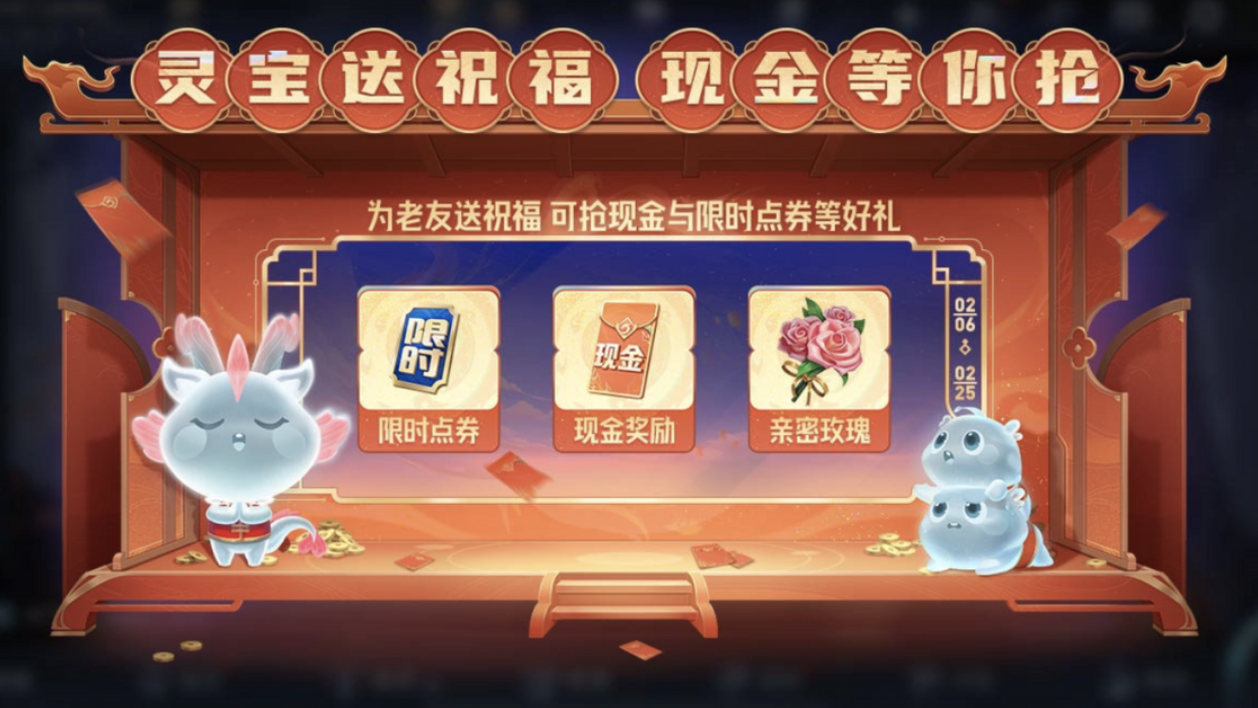 灵宝送祝福是一个互动的活动,玩家可以通过发送和领取灵宝群祝福红包来获得限时点券,还可以给老朋友发送英雄视频祝福,邀请他们回归游戏,然后与他们一起抢现金和点券等好礼。每日发送的灵宝群祝福红包被好友领完后,必得限时点券,而且还有机会瓜分1亿现金红包,灵宝送祝福的活动时间是从2月6日逐步开启到2月19日前可参与,2月20日到2月25日可继续领奖。