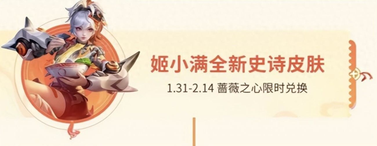 1月31日至2月14日期间,在蔷薇珍宝阁中,姬小满的新春史诗皮肤等待玩家兑换。新年战场上,让姬小满的新皮肤为你带来胜利的喜悦。