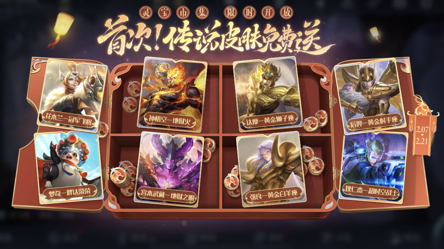 2月7日至2月21日,期间参与灵宝市集活动,通过收集和出售小龙糕兑换小龙币,刷新奖池领取传说皮肤、史诗皮肤等奖励。2月9日除夕夜,首刷必得史诗皮肤和莓莓酥酪*10,让你的新年更加精彩。想要花木兰的冠军飞将,孙悟空的地狱火吗?在这里都能满足你!更有达摩、后羿、梦奇、宫本武藏、张良、狄仁杰等英雄的珍稀皮肤等你来兑!
