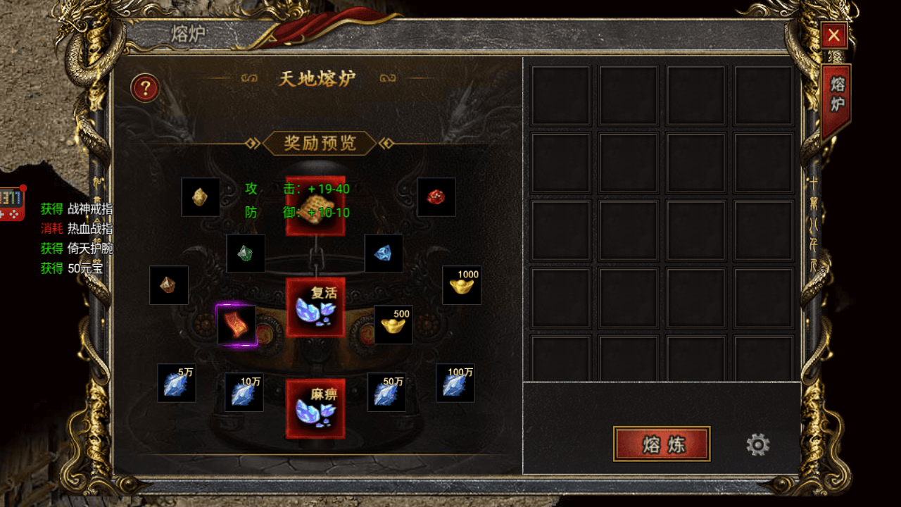 点击界面下方的‘熔炉’按钮,或使用快捷键U键,即可进入到天地熔炉界面,大家在天地熔炉里,在天地熔炉界面中,玩家可以对满足特定要求的装备进行熔炼操作,以获得相应的材料或元宝等奖励。只有星王级以上的装备可以被熔炼,而熔炼这些装备可以随机获得神技书页、木之结晶、特戒碎片等珍稀材料。如果装备是贪狼级或以上,那么在熔炼时必定会获得元宝和极品赦令。熔炼的装备等级越高,玩家将获得的材料就越多。如果玩家购买“地仙·神通万化”的物品,就能够解锁自动熔炼功能。这样玩家无需手动操作即可快速熔炼不需要的装备,从而解放双手。