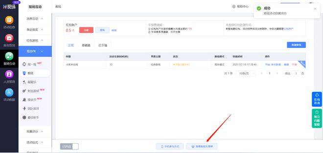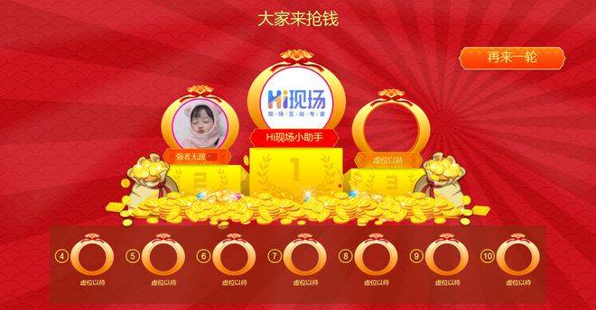 5、抢红包游戏,红包在任何场合都是最受欢迎的,用户通过扫码参与活动,大屏幕和手机上都会通过红包雨的形式来展示,用户只需要快速点击手机上落下的红包雨来抢红包,抢到的红包可以直接提取到个人微信钱包里面的。
