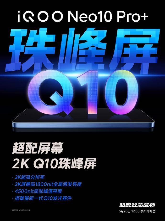 iQOO Neo10 Pro+搭配屏幕,京东方2K Q10珠峰屏,Neo系列首次支持2K超高分辨率,画质细腻动人,144Hz刷新率,同时,Neo10 Pro+的屏幕还支持行业罕见的 144Hz 屏幕刷新率,并具备行业一流触控芯片,实现300Hz触控采样率,依靠行业最低触控时延方案,全新一代超感触控,实现全链路触控时延低至30.4ms,超感触控快人一步,挑战行业最强触控。还有最新圆偏振光护眼技术,实现全场景持久护眼,显示色彩更自然真实。