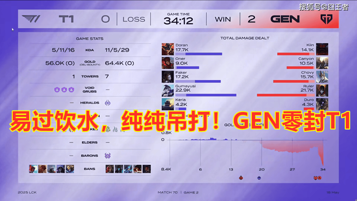 结果第二局比赛,两队在前中期打得比较胶着,经济一直无法拉开差距,直到20分钟左右,GEN才打开局面。比赛第20分钟左右,两队爆发厄塔汗团。Doran兰博空大随后GEN奥恩牛头连续击飞四个打出0换2;比赛第31分钟左右,两队爆发小龙团。GEN追击但伤害不足被T1反杀掉Chovy加里奥;最终比赛第34分12秒,T1抱团开打大龙,Canyon潘森抢到大龙,随后GEN追击打出0换4结束比赛。