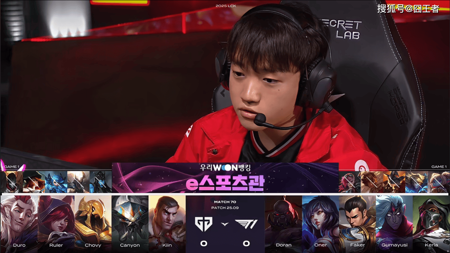 第一局比赛,GEN蓝色方,禁用:卡莉斯塔、潘森、格温、女枪、烬,选用:Kiin杰斯、Canyon蝎子、Chovy沙皇、Ruler霞、Duro洛;T1红色方,禁用:蔚、岩雀、兰博、伊泽瑞尔、波比,选用:Doran塞恩、Oner赵信、Faker阿狸、Gumayusi韦鲁斯、Keria烈娜塔