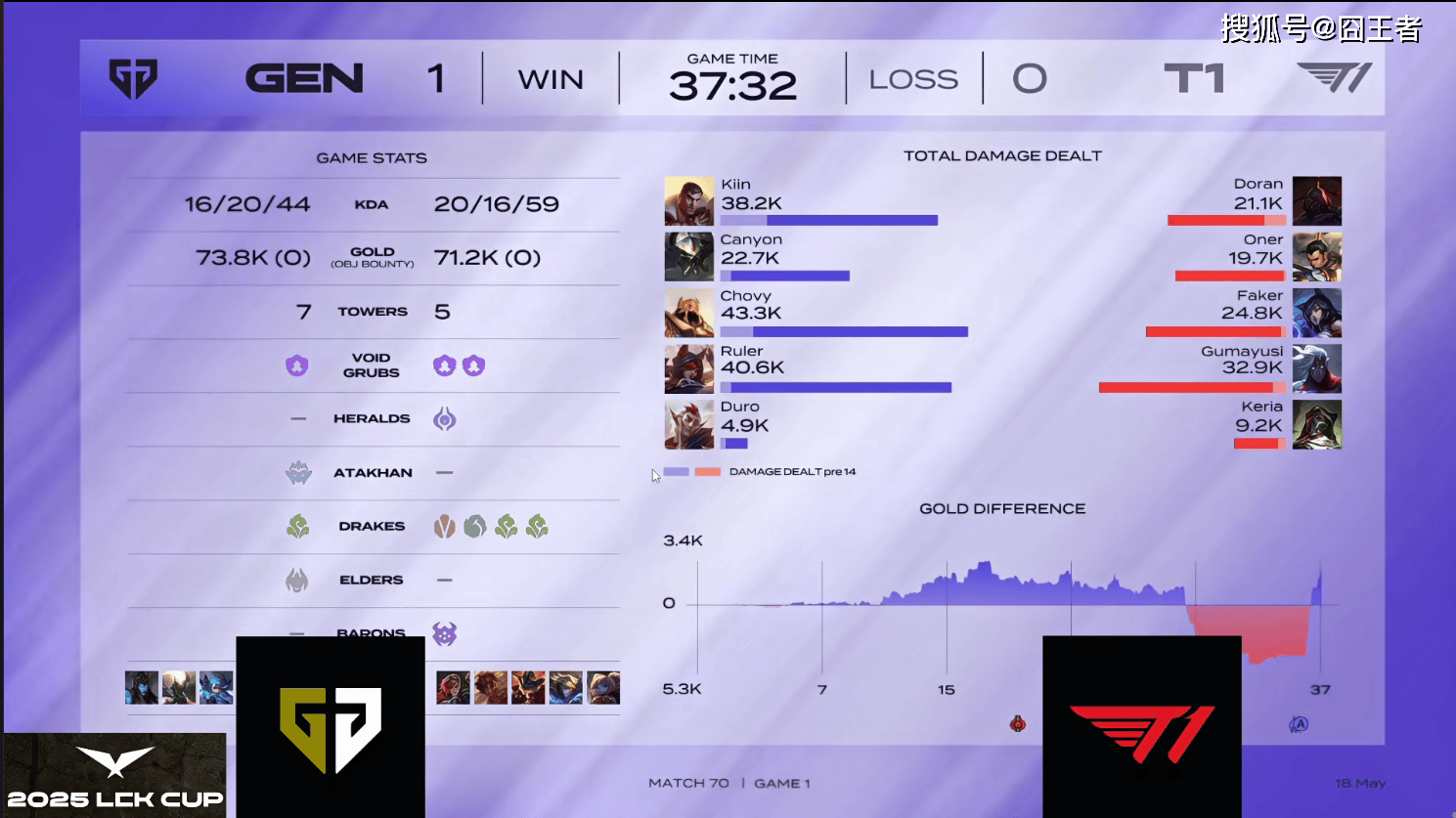 结果第一局比赛,两队各打了半场好局,GEN笑到了最后。前中期,T1占先,打出了近4000的优势。然而比赛第22分钟左右,Doran塞恩贴脸开大撞到Chovy沙皇,T1厄塔汗团先后打出1换3;比赛第29分钟左右,两队爆发龙魂团。GEN先开到Faker阿狸但Keria烈娜塔完美反打帮助T1打出0换5团灭GEN;比赛第31分钟左右,T1带大龙Buff推上,Chovy沙皇塔下推回三个打出1换2打退T1;最终比赛第37分32秒,两队爆发远古龙团。Canyon蝎子拿下远古龙后GEN打出0换5结束比赛。
