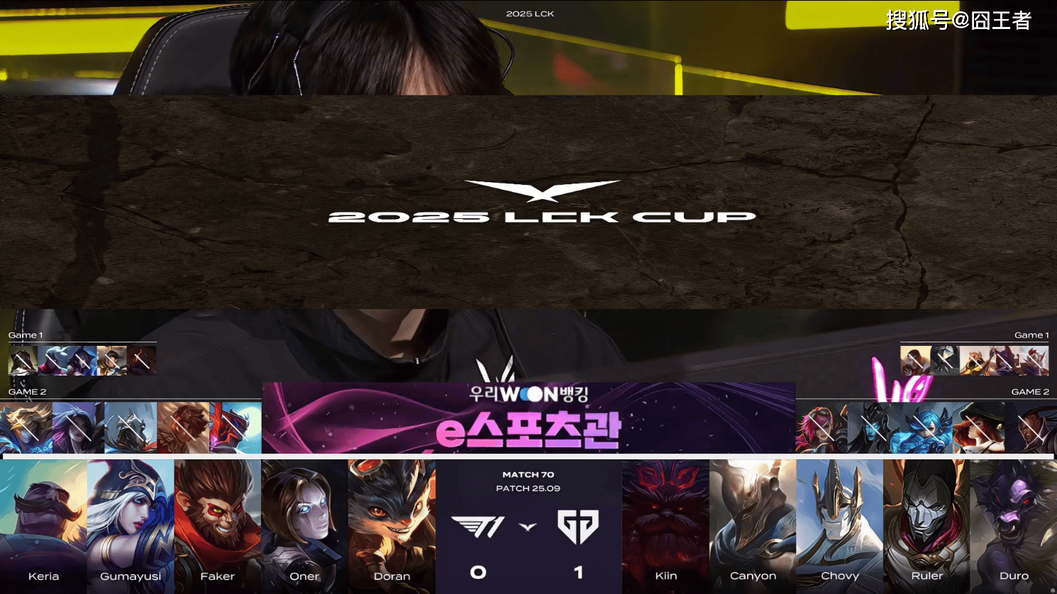 第二局比赛,T1蓝色方,禁用:永恩、岩雀、维克托、卡莎、伊泽瑞尔,选用:Doran兰博、Oner猴子、Faker发条、Gumayusi艾希、Keria布隆;GEN红色方,禁用:蔚、卡莉斯塔、格温、女枪、卢锡安,选用:Kiin奥恩、Canyon潘森、Chovy加里奥、Ruler烬、Duro牛头