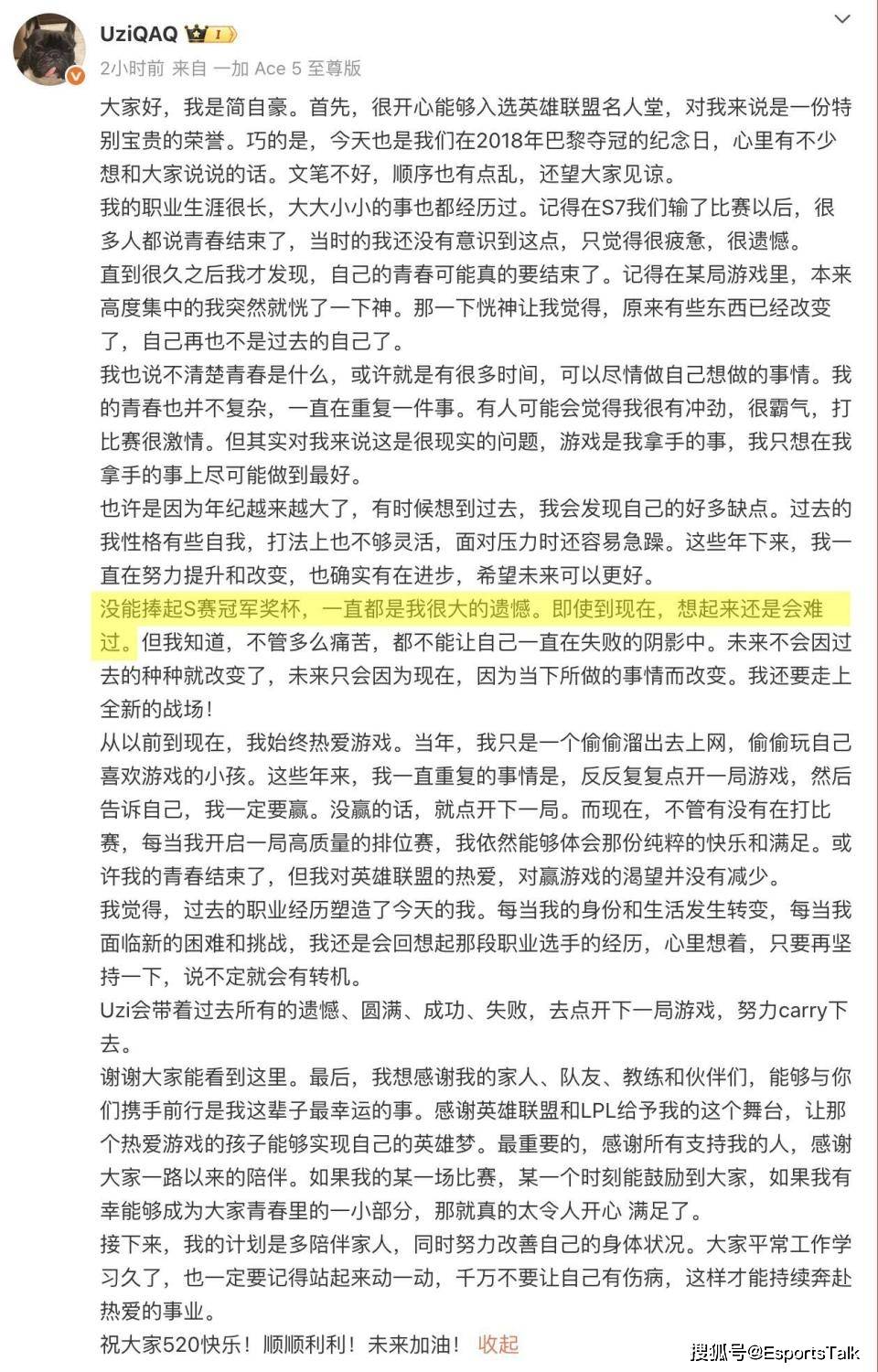 在官方公布Uzi入选名人堂这个消息发布后不久,Uzi就通过社交平台发布了一篇长文,讲述了自己从出道至今的心路历程,其中他也提到了,对于没能拿到S世界赛冠军是人生最遗憾的一件事,即便到了现在,想来依然会很难过。
