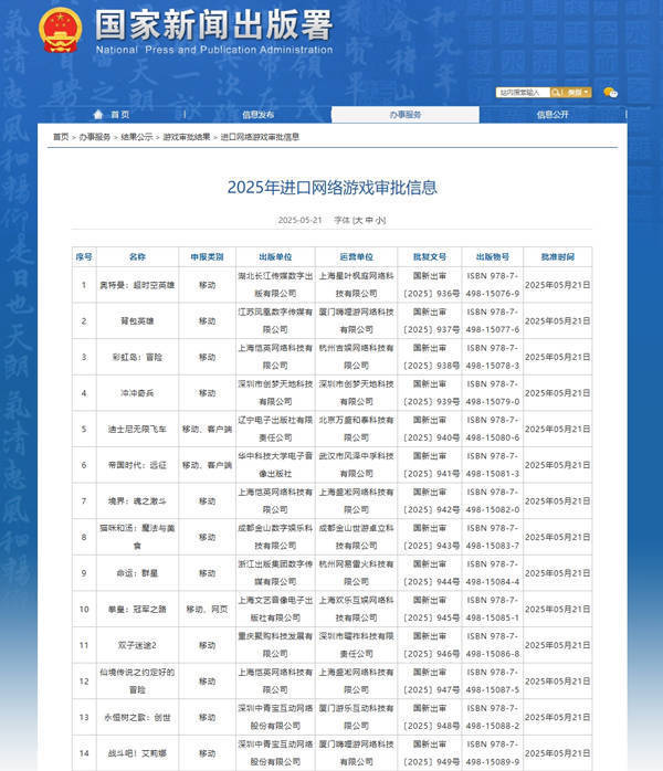 5月21日,国家新闻出版署发布2025年进口网络游戏审批信息,5月共14款进口游戏获批。分别为:《奥特曼:超时空英雄》、《背包英雄》、《彩虹岛:冒险》、《冲冲奇兵》、《迪士尼无限飞车》、《帝国时代:远征》、《境界:魂之激斗》、《猫咪和汤:魔法与美食》、《命运:群星》、《拳皇:冠军之路》、《双子迷途2》、《仙境传说之约定好的冒险》、《永恒树之歌:创世》、《战斗吧!艾莉娜》。