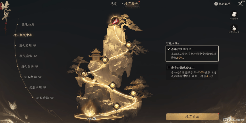 修为成长沿袭修仙体系,通过吸收“灵气”逐步提升境界。每个小境界突破时,玩家可选择不同的修炼方向,主要影响数值成长路径。
