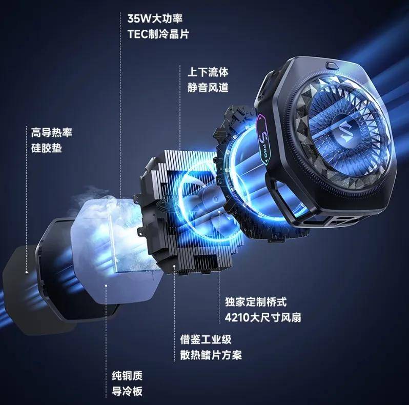 如果说风冷款是人吹风扇,那么半导体款就是人吹空调了,没有热量抵消真会结冰(上面是示意图)。理论上,功率越大制冷效果越强,至少能给手机降温10℃以上,而黑鲨冰封5 Pro捅到了35W,应该是目前功率最大的。虽然改装小圈子有一种DIY款能干到40W,但不算正牌军,要感兴趣我下周单独写在小号。