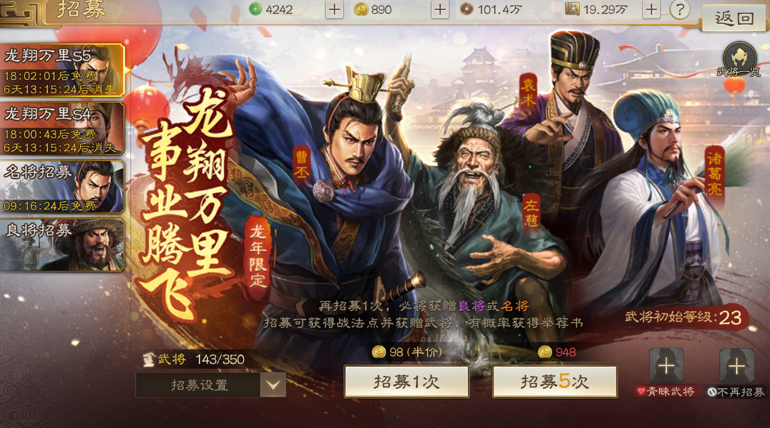 活动五:龙翔万里,每个卡池的免费半价时间是额外计算的,记得两个卡包起码免费都抽掉,这个是每天刷新的,半价抽不抽都可以,看自己。
