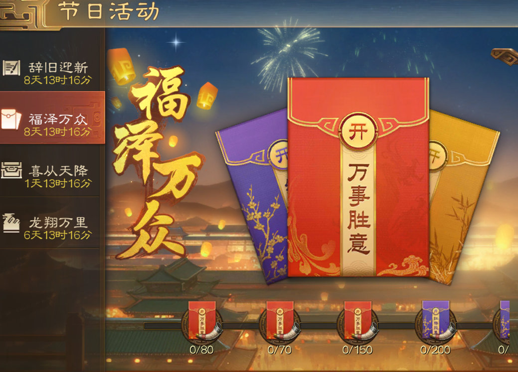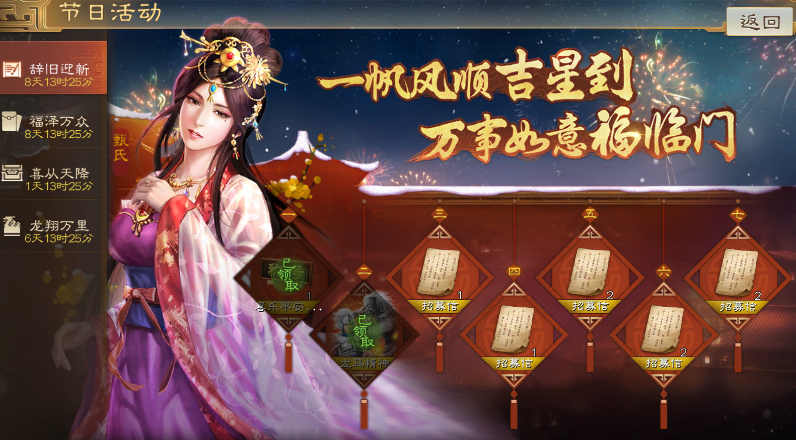 首先是活动一:辞旧迎新,这个上线会自动弹出来,如果错过可以在春节这个图标点进去,第一个就是辞旧迎新活动。