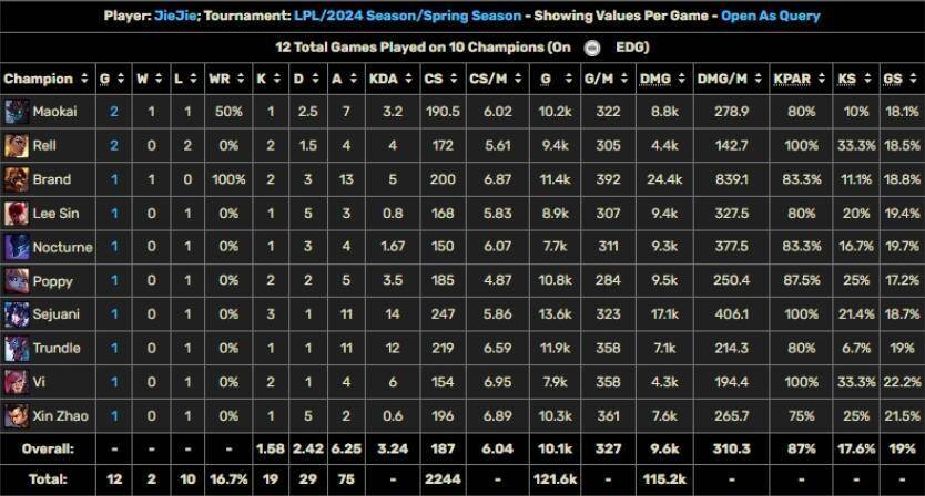 我们看到现在网友们都在吐槽,希望EDG能放过jiejie,因为目前的局势对他来说真的太折磨了,很多人也从最近的比赛中看出来了,Jiejie真的尽力了,数据公布后,大家发现jiejie每一场都希望有胜利的可能。