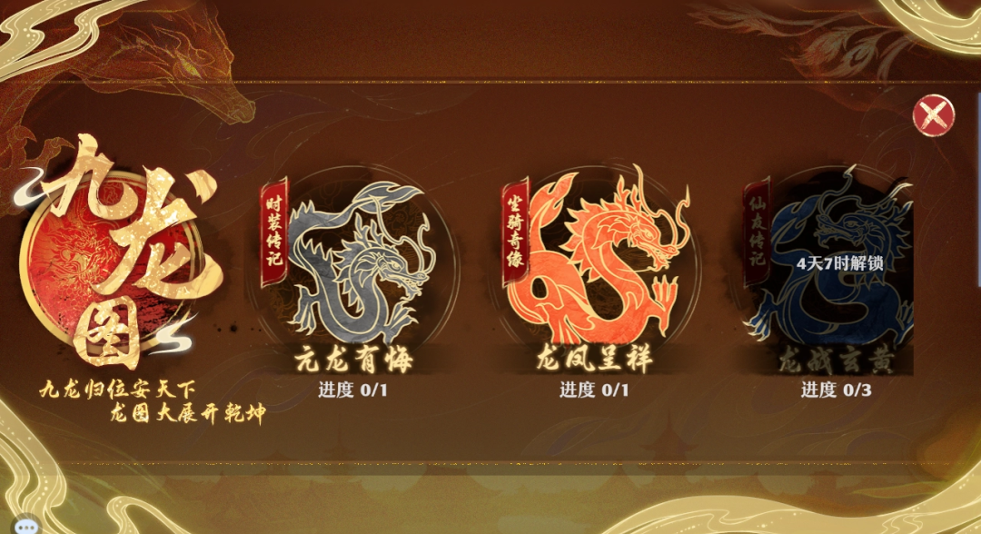 “九龙图”应该是取自“龙生九子”的古代神话传说,该玩法分为“亢龙有悔”、“龙凤呈祥”、“龙战玄黄”等共计九个入口,分别对应了亢龙有悔时装、龙凤呈祥坐骑、玄龙公子仙友等新内容的专属剧情故事。每一段剧情都融入了不少传说和习俗,还是非常有深意的,推荐各位去体验一下。
