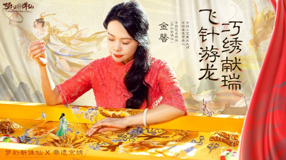 最为重磅的还得是《梦幻新诛仙》X非遗京绣,为了展现龙年的主题,《梦幻新诛仙》官方请到了京绣非遗传承人金馨,携手打造了联动限量时装“飞龙在天”,让我们可以通过数字化近距离的感受一针一线的非遗技艺之美。