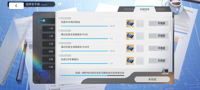科研任务则是面向Lv达到30的指挥官,这个阶段指挥官开始接触科研系统相关的玩法,因此完成该模块下的任务可以快速获取科研测试数据和高级定向蓝图等奖励。如果指挥官当前没有正在进行的科研任务,则可以自选一期任务开始。友情提醒:选定一期任务并开始后,将不能切换至其他期任务,直到完成该期所有科研任务。