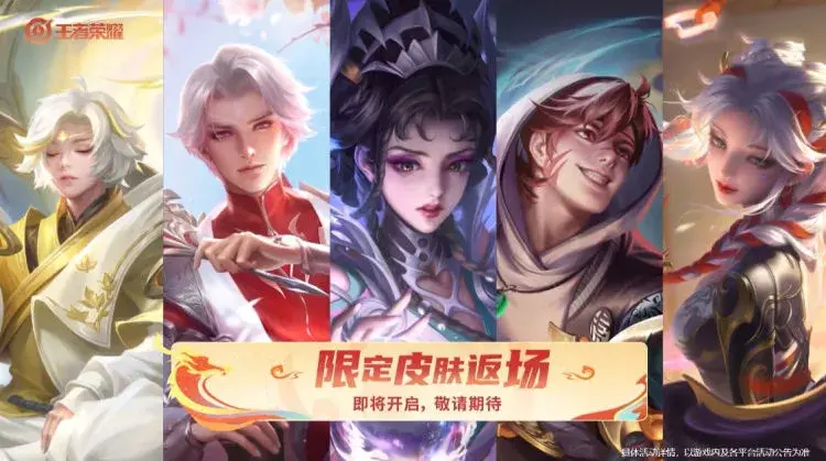 除了已经提到的活动外,还有五款限定的皮肤即将迎来再次上架,分别是庄周的“玄嵩”、诸葛亮的“武陵仙君”、芈月的“白晶晶”、裴擒虎的“赤拳”以及杨玉环的“心曲”。除了“武陵仙君”和“玄嵩”是抽奖返场为,其他三款都是以直售的方式返场。所以喜欢的小伙伴们赶紧冲呀!
