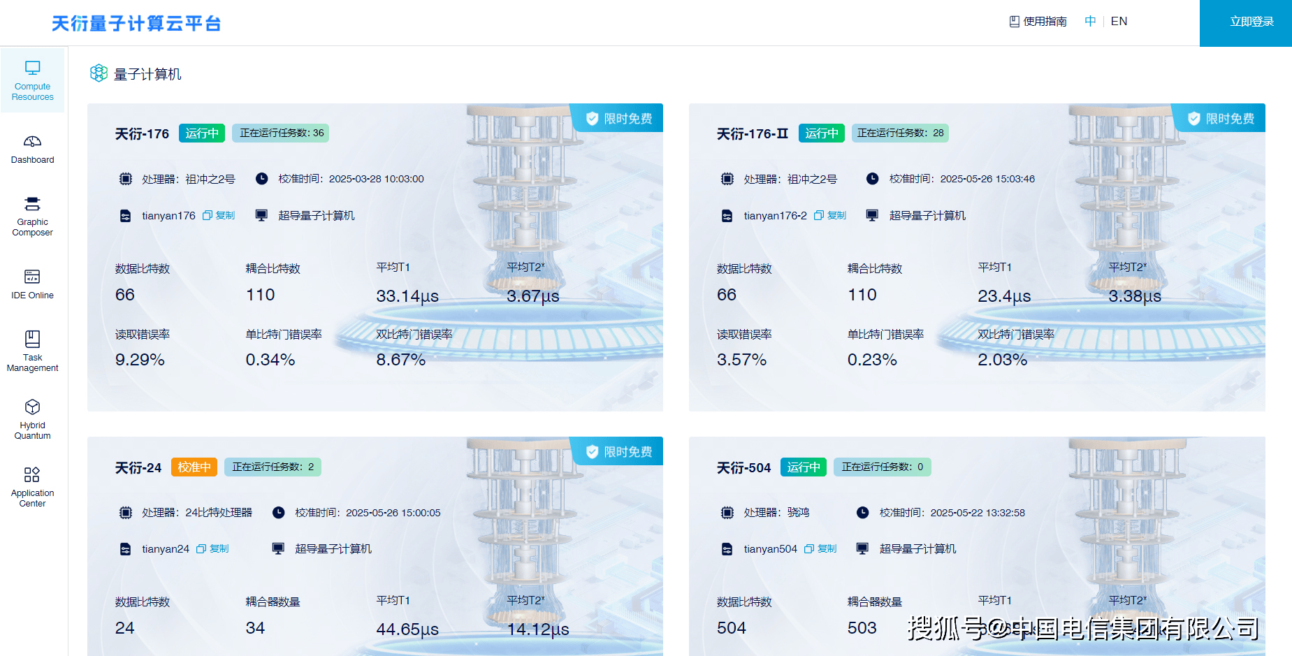 目前,平台接入了由一台24比特、两台176比特和一台504比特量子计算机组成的880比特超导量子计算集群,成为国内现阶段接入规模最大的公有量子计算资源,并仍在持续扩容中。