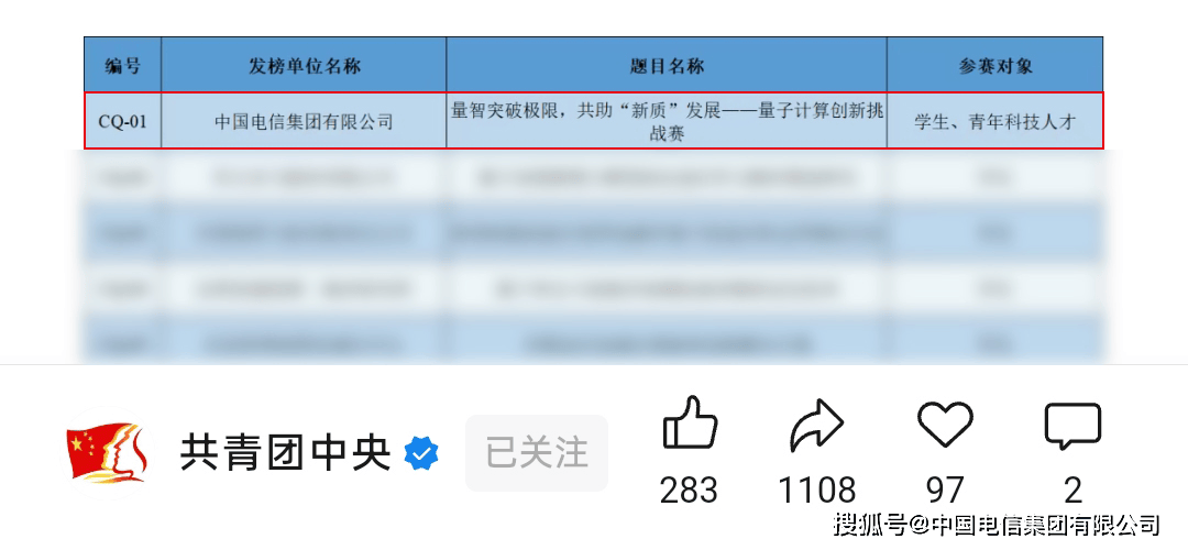 在加快实现高水平科技自立自强的国家战略背景下,由共青团中央牵头主办的第十九届“挑战杯”竞赛2025年度中国青年科技创新“揭榜挂帅”擂台赛正式启动!赛事聚焦“卡脖子”关键核心技术,围绕国家重大需求精准出题,广邀全国青年科技力量共赴“揭榜之约”,中国电信作为发榜单位之一,发布“量智突破极限,共助‘新质’发展——量子计算创新挑战赛”,中电信量子集团具体执行。