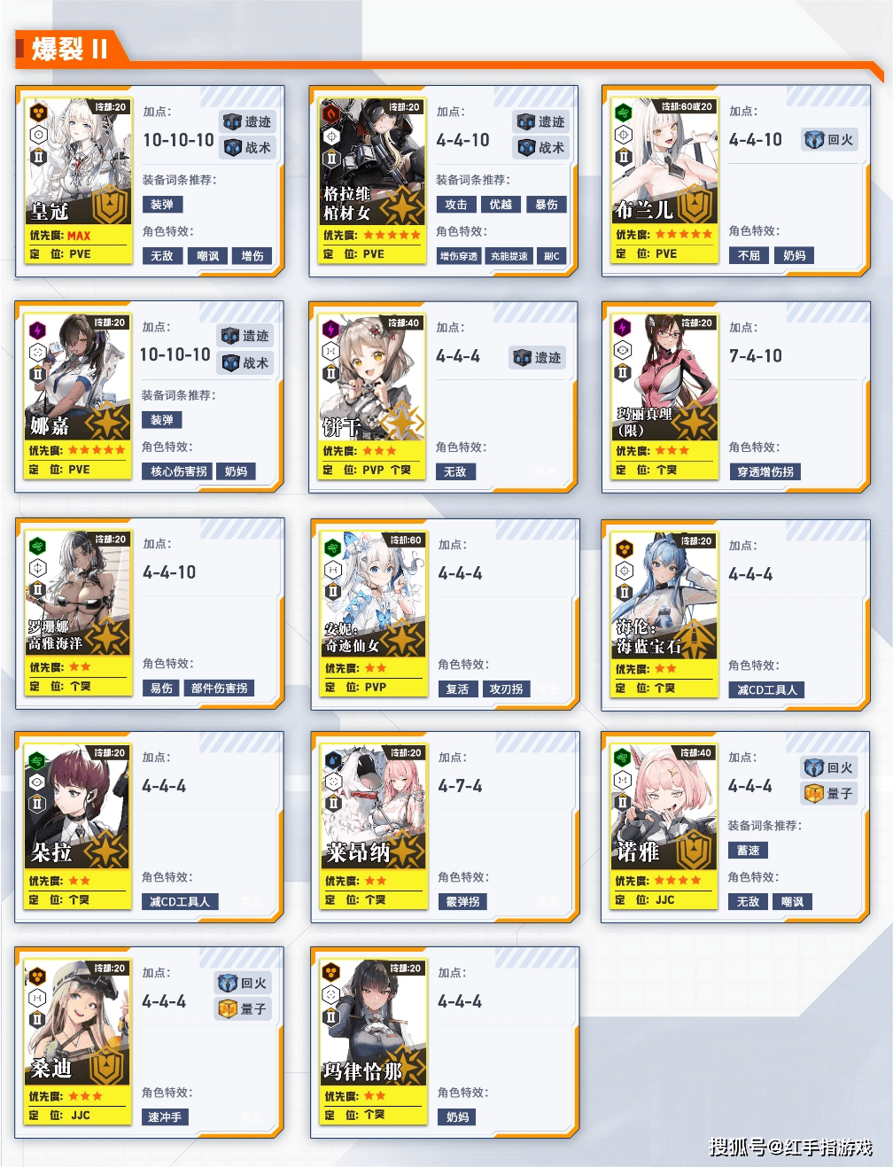 哈兰(SSR,爆裂 III):狙击破甲 + 激素增益,单体爆发高,PVP/PVE 均衡,搭配丽塔可快速触发激素。