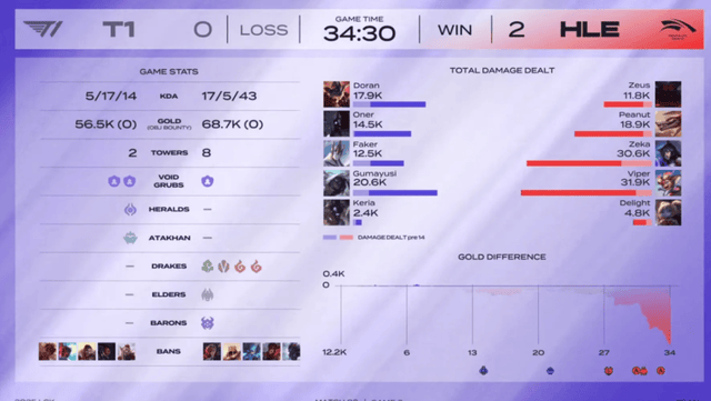 更让T1粉丝们难以接受的是,这已经是T1对阵HLE在各项赛事中的七连败,上次获胜还要追溯到2024年4月13日的LCK春季赛季后赛,当时T1以3比1战胜HLE,但在之后就几乎都是被HLE横扫,最近两场更是全被剃了光头,败得一塌糊涂。