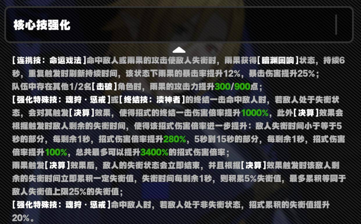 通过强化特殊技/终结技结算敌人剩余失衡时间,最高提升3400%伤害倍率,需搭配双击破队友(莱特+莱卡恩)触发900点攻击加成。