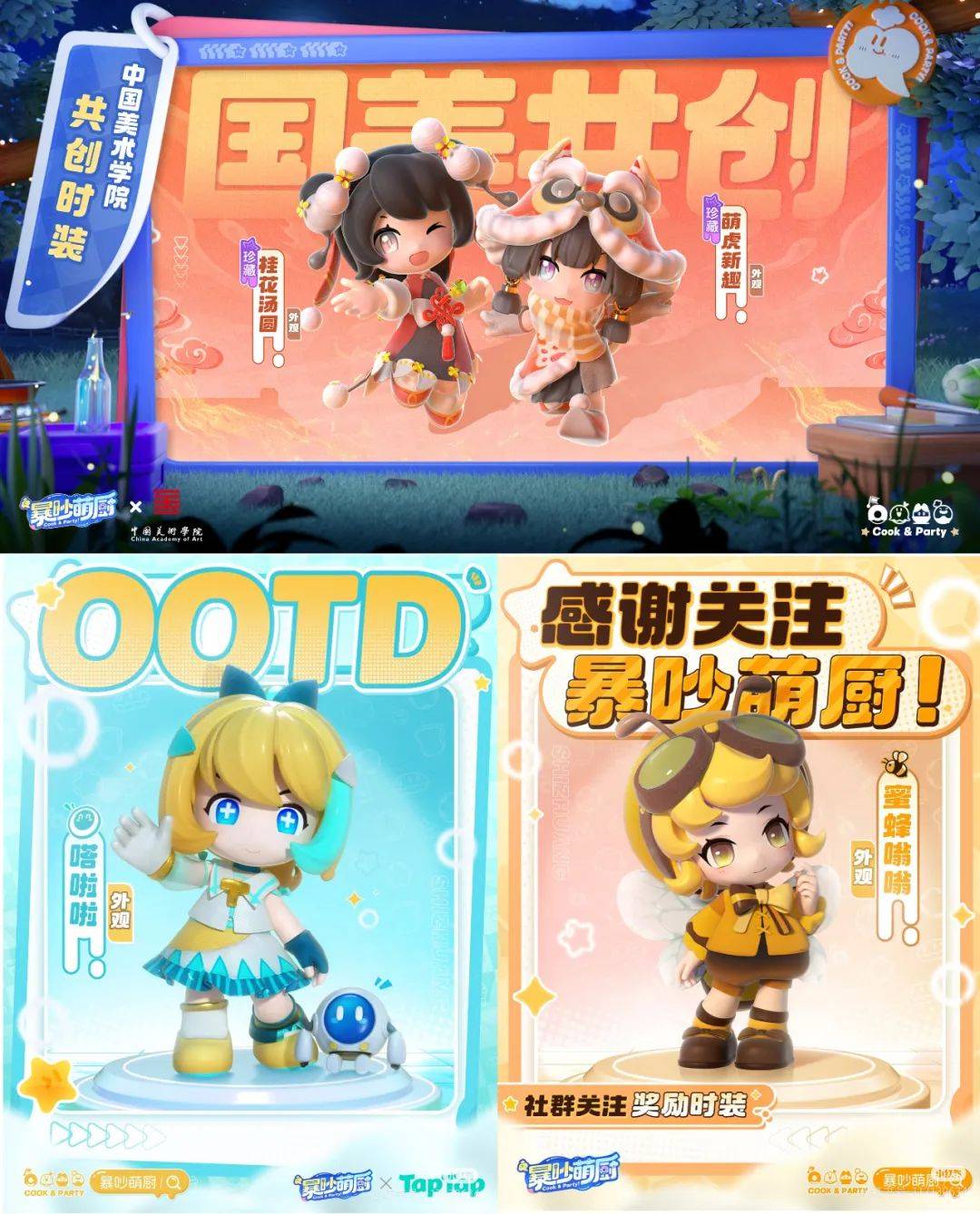 而中国美术学院则以“桂花汤圆”和“萌虎”作为灵感来源,为游戏设计了对应的联动服装,为游戏的美术风格注入新的国风时尚。甚至,TapeTap也和《暴吵萌厨》推出了联动服装。这让玩家感叹:这算是破次元壁了!