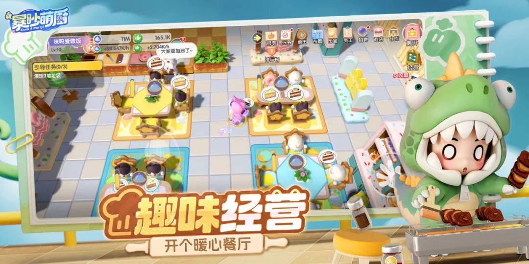 究其原因,它选择了年轻女性钟爱的“潮玩画风”做糖纸,包裹“中华美食厨房派对+餐厅休闲经营“的差异化烹饪玩法,盛上了一场动静相宜的“美食派对盛宴”,这也使其在国内派对手游中形成自有特色。