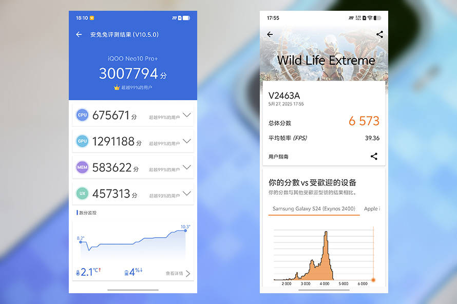 说完外在表现,再来看下内在配置。作为一款中端机型,iQOO Neo10 Pro+这次搭载了骁龙8至尊版芯片,并且在此基础上,还搭载了自研的电竞芯片Q2,通过双芯组合,为玩家带来了王炸级的体验。