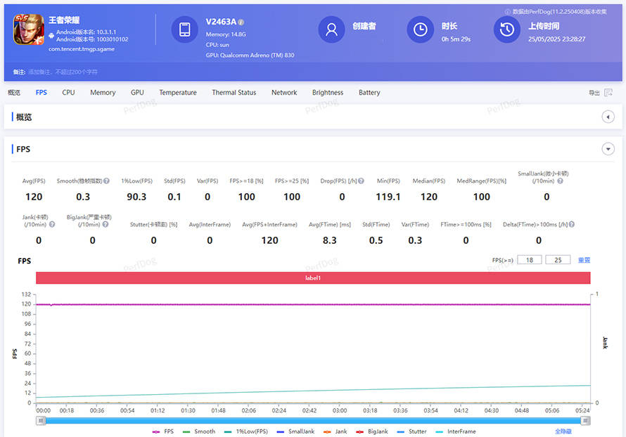 我们直接看实测,可以看到,《原神》平均帧率在60fps,《王者荣耀》则是稳在120fps,可以说稳帧这种操作,iQOO Neo10 Pro+是完全没有压力的。